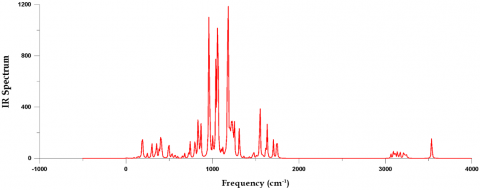 The IR spectra of D1 Phenyl-P and D2 10 MDP Dental polymers are shown in Figures 8 and 9. The figures show the density functional theory (DFT) (B3LYP) utilizing the Gaussian 90 program with (6-31Ĝ) basis sets.