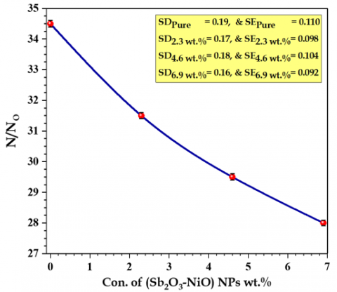 In this context, N₀ denotes the count of radiation particles detected during a designated time frame without any absorber, whereas N signifies the count of particles identified in the same time frame after traversing a material of thickness t. The value μ represents the linear attenuation coefficient of gamma radiation. Figure 14 depicts the influence of nanoparticles on the gamma ray attenuation graph, demonstrating the variation in the (N/N0) ratio with varying quantities of Sb2O3/NiO particles incorporated into the PVA polymer matrix. The reduction in radiation transmission with higher concentrations of Sb2O3/NiO particles is attributed to the material's enhanced capacity to absorb and attenuate radiation, resulting in less intensity of radiation passing through the sample [61]. Figure 15 shows how the gamma radiation attenuation coefficients are affected by the concentration ratio of (Sb2O3/NiO) NPs. The attenuation coefficients increase as the quantity of nanoparticles rises. This is because the shielding materials included inside the nanoparticles enhance the effectiveness of the shielding by absorbing or reflecting gamma radiation. The elevated atomic numbers of both Sb2O3 and NiO lead to the maximum attenuation coefficient values seen in polymer nanocomposites containing these particles. Consequently, augmenting the Sb2O3/NiO level in the nanocomposite markedly improves its radiation shielding efficacy [62]. In comparison to other frequently utilised fillers, including bismuth oxide (Bi2O3), tungsten oxide (WO3), and lead oxide (PbO), which generally exhibit RSE values between approximately 12% and 25% based on filler concentration and incident radiation energy, the Sb2O3/NiO system emerges as a viable alternative. Despite lead oxide's exceptional attenuation properties attributed to its elevated atomic number and density, its toxicity restricts its extensive use. Although lead is the most efficient material for gamma-ray attenuation, it presents considerable environmental and health hazards and is inflexible. The PVA/Sb2O3/NiO nanocomposite provides a non-toxic, lightweight, and flexible option, rendering it suitable for wearable and low-to-moderate shielding applications. Through ongoing enhancement of nanoparticle incorporation and thickness, these nanocomposites could significantly contribute to advanced radiation protection technologies [63].