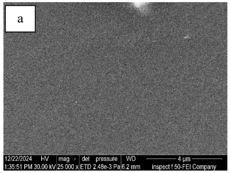 FE-SEM was used to examine the distribution of nanoparticles within the polymer matrix, enabling us to confirm the influence of (Sb2O3/NiO) NPs on the properties of the nanocomposite. Figure 1 shows FE-SEM photographic of PVA/Sb2O3/NiO nanocomposites films at (20 KX) magnification and a scale of 4 μm, showing the distribution of nanoparticles at different concentrations. Image (a) shows a smooth and homogeneous polymer surface, demonstrating the success of the preparation method. Images (b, c, and d) clearly highlight the dispersion of (Sb2O3/NiO) NPs within the polymer matrix, with an increase in grain size as the nanoparticle concentration increases, reflecting the homogeneous and efficient distribution of these particles within the composite material [34].