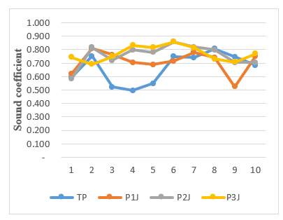 The results of measuring the composite sound absorption coefficient on composites without treatment and with treatment variations. From the data results, the difference in sound absorption coefficients in treatment variations can be seen in Figure 11.