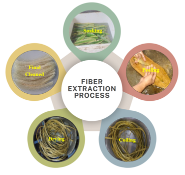 The fiber extraction process (Figure 2) was carried out using the water immersion method, in which plant stems were cut, separated from their roots, and soaked in fresh water for 3–4 weeks until decomposition occurred. The degradation process was indicated by leaf softening, brown discoloration, and the release of an unpleasant odor. During immersion, microbial activity facilitated the breakdown of non-cellulose compounds, weakening the bonds between cellulose fibers and other structural components. After the immersion period, each stem produced 10–20 single fibers, which were manually extracted using a hair comb, thoroughly washed with distilled water, and air-dried at ~25℃ to prevent bleaching [28].