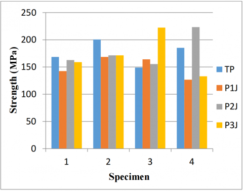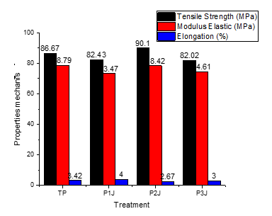The tensile strength analysis of Sansevieria trifasciata Laurentii Fibres fibre-reinforced composites treated with liquid smoke demonstrated an improvement in mechanical properties. The tensile strength of the untreated TP composite was 86.67 MPa, whereas the P2J treatment increased the tensile strength to 90.10 MPa. These findings align with previous research, which reported that liquid smoke treatment enhances the mechanical properties of natural fibers [18, 19, 29] and improves fiber-matrix bonding [20, 22].