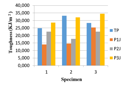 Based on the impact test observations, the impact strength of the untreated composite (TP) was 28.788 KJ/m². An increase was observed in the 3-hour liquid smoke-treated composite (P3J), which reached 31.727 KJ/m². These results are consistent with previous studies indicating that liquid smoke treatment enhances the mechanical properties of composites [12, 27, 37].