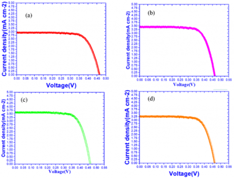 Figure 5. J-V curves of Cs₂NaBiI₆-based solar cells with Mg doping levels of (a) 0%, (b) 1%, (c) 3%, and (d) 5%