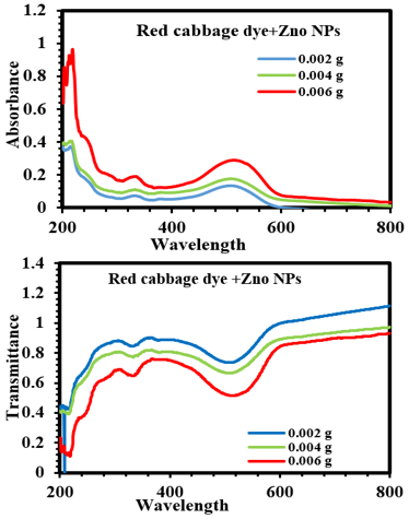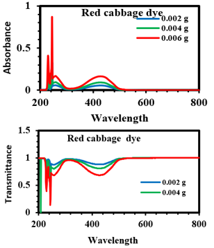 The absorbance and radiation transmission curves of red cabbage dye diluted in distilled water solvent at varying weights 0.002 g, 0.004 g, and 0.006 g are displayed in Table 1 and Figure 4. As can be seen from the figure, the absorbance increases and the transmittance decreases as the dye concentration rises. The rise in the dye's concentration in the solvent is the cause of this, and this It complies with the legislation of Beer-Lambert. The absorbance curves reveal two electronic transitions: the first, caused by the transition type δ-δ*, occurs in the UV region at a wavelength of 250 nm, and the second, caused by the transition type π-π*, occurs in the visible light region at a wavelength of 426 nm.