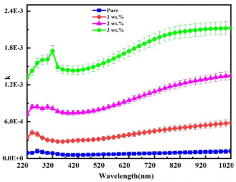 Figure 10 illustrates how the extinction coefficient of nanocomposites (PVA/CuO-In2O3) varies with the wavelength (λ). These figures demonstrate that as the wavelength of light that enters the UV region rises, so does the extinction coefficient of (PVA/CuO-In2O3) nanocomposites, which are highly absorbent in these regions. The practically constant absorption coefficient of the nanocomposites in the visible and near-infrared regions also explains why their extinction coefficient increases in these areas [65-67]. As a result, the extinction coefficient varies with the wavelength. The extinction coefficient of (PVA/CuO-In2O3) nanocomposites is directly proportional to the concentration of (CuO-In2O3) nanoparticles, which increases with higher concentrations. This is owing to the higher absorption coefficient of the nanocomposites [68-70]. The rise in extinction coefficient for (PVA/CuO-In2O3) nanocomposites is 53%.