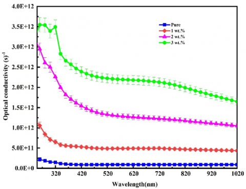 Figure 11. The optical conductivity of (PVA/CuO-In2O3) nanocomposites varies with wavelength