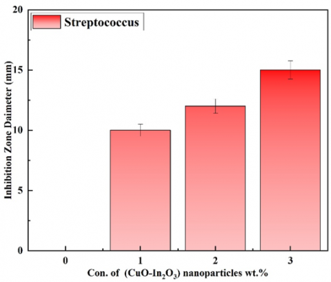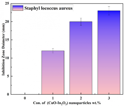 Figures 12-14 demonstrate that (PVA/CuO-In2O3) nanocomposites possess antibacterial properties against Streptococcus and Staphylococcus aureus. A higher concentration of (CuO-In2O3) nanoparticles results in a larger inhibitory zone. Their antibacterial action may be better understood if charge-negative bacteria are attracted to positively charged nanoparticles in nanocomposites by means of electromagnetic fields. Bacterial cells become oxidized and die instantly because of this process [73-75]. The release of electron-hole pairs from (CuO-In2O3) nanoparticles upon exposure to visible or ultraviolet light is another potential mechanism by which the nanocomposites exert their antibacterial activity [12, 76, 77]. The generation of reactive oxygen species (ROS) is a well-known and effective mechanism for the antibacterial effect of metal oxide-based nanomaterials. Although the mechanism proposed in this work is supported by previous results, direct experimental verification remains necessary to strengthen this hypothesis. Future studies suggest using specialized ROS detection assays, such as the DCFH-DA fluorescence assay, electron paramagnetic resonance (ESR), or chemical inhibitor tests, to directly confirm the generation of these reactive species.