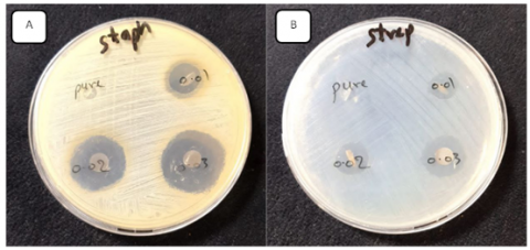 Figure 14. Antibacterial activity of (PVA/CuO-In2O3) nanocomposite. Zone of inhibition of (PVA/CuO-In2O3) nanocomposite against A: Staphylococcus, B: Streptococcus