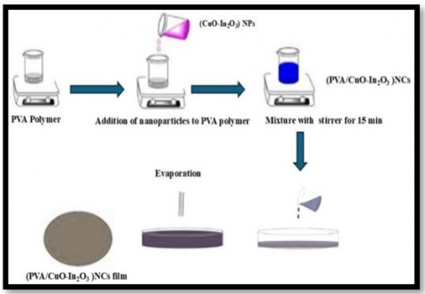 PVA/CuO-In₂O₃ nanocomposite films are fabricated using a solution casting technique. Initially, 1 g of polyvinyl alcohol (PVA) is dissolved in distilled water using a magnetic stirrer for continuous stirring. CuO-In₂O₃ nanoparticles are then added to the polymer solution at concentrations of 1%, 2%, and 3% by weight. The mixture is stirred for 15 minutes at 70℃ to ensure complete homogeneity. It is left to settle to eliminate air bubbles and to further stabilize the solution. The homogeneous solution is then poured into a 5 cm diameter Petri dish and left to dry at room temperature for 3 to 7 days. After complete drying, the formed films are carefully separated from the mould. Their thickness is measured using a micrometre. The structural, optical, and morphological properties of the composite nanofilms are analyzed using scanning electron microscopy (SEM), Fourier transform infrared spectroscopy (FTIR), and ultraviolet-visible (UV-Vis) spectroscopy. The optical properties are measured in the spectral range of 200-1100 nm using a Shimadzu UV-18000A dual-beam spectrometer.