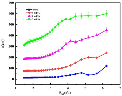 The absorption coefficient α for (PVA/CuO-In2O3) nanocomposites is shown in Figure 6 as a function of wavelength. Because the energy of the incident photon is too low to transfer an electron from the valence band to the conduction band, the absorption coefficient is the lowest at long wavelengths and low energy, ruling out the possibility of electron transfer. An increase in energy makes absorption better, which means there are more electron transitions. Consequently, an electron can move from the valence band to the conduction band by means of the incident photon's energy [51, 52]. At lower energies, when the absorbent coefficient is low (104 cm-1), electrons are predicted to transition indirectly with the phonon maintaining their electronic momentum [53, 54].