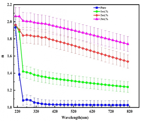 Figure 9 presents the refraction index of (PVA/CuO-In2O3) nanocomposites as a function of wavelength. The findings show that as the weight proportion of the percentage of (CuO-In2O3) nanoparticles rises, so does the refractive index. The noticed rise in refractive index is thought to result from increased nanocomposites' density. Nanocomposites are made denser by adding nanoparticles to a polymer matrix. With a higher density, there are more atoms and molecules per unit volume, which in turn raises the refractive index [61, 62]. The refractive index rises as incoming light interacts with substances that are highly UV-refractive. Finding a correlation between CuO-In2O3 nanoparticle concentration and refractive index has important implications for developing new nanocomposite materials [63, 64].
