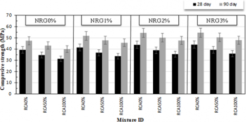 Figure 10. Development of compressive strength in RCA, NRG modified SCC-NGRA. Variability indicated by ACI 214R-1, based error bars. Normalized 28 and 90 days deviations (%) are labeled