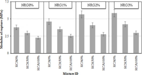 Figure 12. Development of flexural strength in RCA, NRG modified SCC-NGRA. Variability indicated by ACI 214R-11, based error bars. Normalized 90 days deviations (%) are labeled