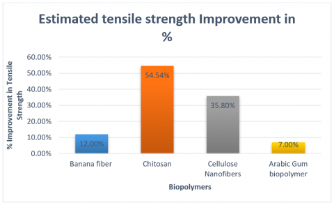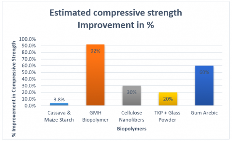 Biopolymers like cassava and maize starch, gum Arabic, and cellulose nanofibers contributed to improving compressive and tensile strength by refining pore structures, enhancing hydration, and bridging microcracks.