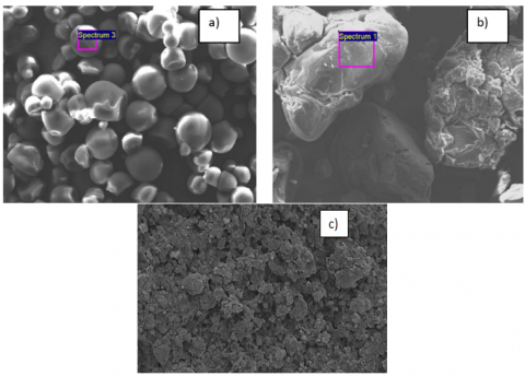 Figure 16. a) Scanning electron microscope images of cassava starch [37], b) Maize starch [37], c) Chitosan biopolymer [38]