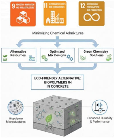 The United Nations' Sustainable Development Goals (SDGs) offer a universal framework for tackling urgent global issues, with Goals 9 and 11 being especially pertinent to contemporary civil engineering and urban development. Goal 9 underscores the necessity for robust infrastructure, sustainable industrial advancement, and innovation, which are essential for economic development and public welfare. Goal 11 aims to convert urban areas into inclusive, secure, resilient, and sustainable settings, tackling the issues of growing urbanization and the necessity for strategic development. Collectively, these objectives advocate for interdisciplinary methodologies, blending intelligent technologies, policy formulation, and community involvement to establish sustainable and habitable cities for future generations [1]. In this perspective, reducing the utilization of chemical admixtures in building aligns with SDG 12 Responsible Consumption and Production. This can be accomplished by employing alternative resources, refining mix designs, and implementing innovative green chemistry solutions, as depicted in Figure 1.