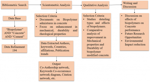 This review uses a technique that combines bibliometric and qualitative methodologies to provide a thorough evaluation of research on biopolymer-modified concrete. A bibliometric search was conducted utilizing the Scopus database with the search term ("Biopolymer" AND "Concrete") OR ("Biopolymer" AND "Cement"), resulting in an initial output of 194 documents. Considering that all retrieved documents pertained to the investigation, the entire dataset was utilized for bibliometric analysis.