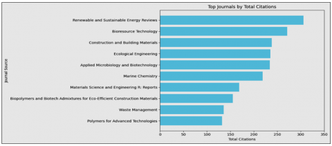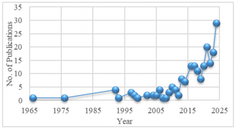 The year-wise publication data related to the use of biopolymers in concrete (Table 1) shows a gradual increase from the 1960s, with a notable surge after 2010. A significant rise is observed from 2016 onward, peaking in 2024 with 29 publications, indicating growing research interest in this field.