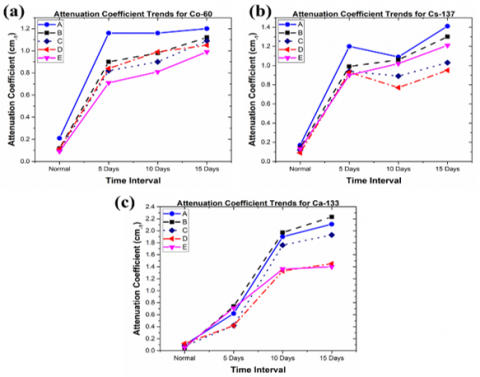 Figure 1: (a-c) shows the attenuation coefficients μ of composite samples A, B, C, D, and E for Co-60, Cs-137, and Ba-133 gamma-ray sources, respectively. These give the shielding performance of these materials as well as the effect of the time of gamma-irradiation, hence providing insight into how the shielding performance of these materials will change.