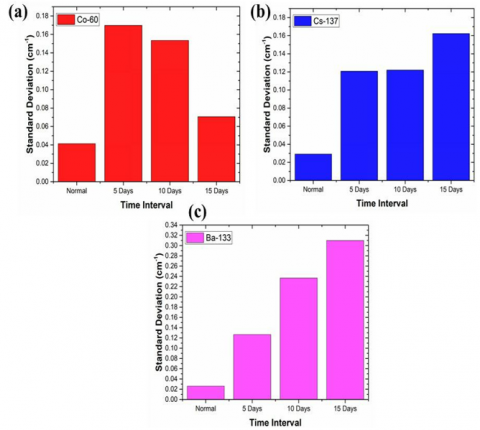For the Co-60 source (Figure 3(a)), indicates that the standard deviation increases extensively after 5 days to a maximum of ~0.17 and then decreases gradually at 10 and 15 days. The increases in this standard deviation in the first place reflect substantial structural changes by high-energy photons (1.17 and 1.33 MeV) such as crosslinking and densification. These changes introduce materials property variability in attenuation performance. With prolonged time, a stabilization in variability points to equilibrium in structural rearrangements, leading to a much more consistent attenuation performance. Similar behavior has been observed by Joshi et al. [20], where epoxy-based composites showed initial variability due to irradiation-induced restructuring, followed by stabilization.