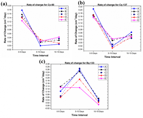 The photoelectric effect is thus the main interaction mechanism of the low-energy gamma photons they emit, most at 0.356 MeV, for these polymer samples. The influence of the rate of change in attenuation coefficient for Ba-133 with PVC content was very sensitive to the PVC content. Relatively positive sample rates of change in the 0–5-day interval were recorded for samples with high PVC, namely Samples B and E. The high atomic number of chlorines in PVC can explain this positive trend due to the significant photoelectric absorption and gamma attenuation.