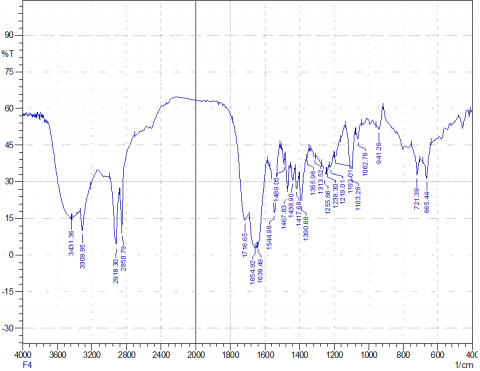 The infrared spectra of the F2 copolymer are shown in Figure 4(a). It is characterized by a broad band at 3437 cm-1 attributed to the O-H group, which appears broad due to hydrogen bonding and its overlap with the N-H stretching band. which appears in approximately the same region. The band in the range of 2777-2950 cm-1 corresponds to aliphatic C-H stretching vibrations. A distinct band observed at 2245cm-1 is assigned to the nitrile group. The band at 1701 cm-1 corresponds to the carbonyl group (C=O) of the carboxylic acid, while the band at 1653cm-1 is attributed to the amide carbonyl (C=O) group.