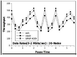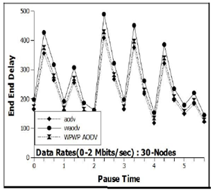 Figure 2, Figure 3, and Figure 4 show the end to end delay of 10, 30 and 50 nodes in normal situation, under wormhole attack and under WPWP. Under WPWP end to end delay is moderate with 10 nodes and for 30 and 50 decreases drastically compared to wormhole AODV, but it is greater than normal as it induces some computation which itself take some delay processing at the ends which can be ignored as it is so marginal but when some of the computation is shared with RSU it gives better results which brings down end to end delay significantly.