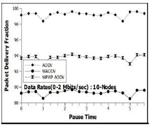 Figure 5, Figure 6, and Figure 7 show the packet delivery fraction of 10, 30 and 50 nodes in normal situation, under wormhole attack and under WPWP. Under WPWP packet delivery fraction increases countably compared to wormhole AODV as the number of packet drops by the attackers reduces drastically as the attacking nodes are isolated which shows a significant improvement in the defense against wormhole attacks.