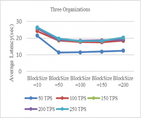 Three different scenarios have been proposed: one, two, and three organizations (two peers per organization and one endorser peer in each organization) with two metrics to monitor; throughput and average latency. Throughput is the rate at which transactions are successfully processed when it is included in a block and committed to the ledger as part of the blockchain in transactions per second. Throughput was given in Eq. (1), where TRT is transaction throughput, tct is total committed transaction, tti is total time.
