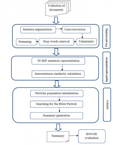 The summary may be extractive or abstractive, depending on the approaches in which it is generated [3, 4]. Extractive approaches [5-7] generate a summary by selecting the pertinent sentences from the source text. Whereas, abstractive approaches [8, 9] generate the summary using new words or sentences that are not necessary present in the original text. For the aforementioned reason, extractive approaches are the most commonly used in the literature. In addition, Extractive approaches frequently show better results compared to abstractive ones [10]. In the study [11, 12], a hybrid technique is used to combine the extractive and the abstractive approaches. Considering the objective, the summary can be generic or query-oriented [4, 13]. The generic summary [14, 15] is generated based on the main content of the original document without using any additional information. But, the query-oriented summary [16] is based on the information contained in the given query. The summary can be divided into single-document and multi-document summaries considering the number of documents to be summarized [3, 13]. Multi-Document Summarization (MDS) is more challenging than single-document summarization [17], due to the size of the documents and the multiplicity of topics. MDS is classified as an NP-hard problem due to the tremendous amount of texts and the vast number of sentence combinations that need to be considered and selected in the summary.