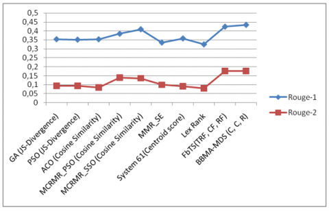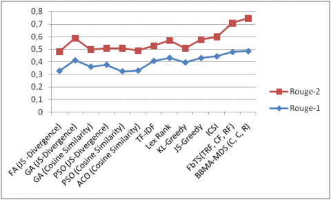 In the research [28], a new MDS approach based on the firefly algorithm is proposed; to measure the quality of the resultant summary, the authors used a new fitness function composed of three factors; topic relation factor, cohesion factor and readability factor. The benchmark datasets used in the experiments are DUC2002, DUC2003 and DUC2004. The performance of the proposed summarization approach is compared with other summarization works which use nature-inspired algorithms such as genetic algorithm (GA) and PSO. The evaluation criteria used in the experiments are the ROUGE score. The results show that this approach is more efficient than other approaches.