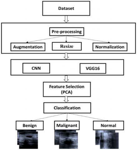 The study presented aims to classify breast ultrasound images as benign, malignant, or normal using CNN and VGG16 feature extraction methods. Feature selection using Principal Components Analysis is also applied to reduce the dimensions of the dataset while retaining as much variance as possible in the data. The study is evaluated based on its accuracy, precision, F1 score, and recall. The real dataset used comprises 1059 breast ultrasound images, augmented for better performance and accuracy. The proposed technique's classification accuracy ranges from 93% to 97%. Table 5 shows previous work in comparison to the proposed method.