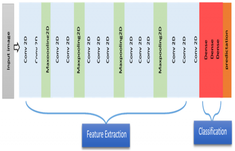 VGG16 is a specific CNN architecture that was advance by the Visual Geometry Group at the University of Oxford. It consists of 16 layers, with 13 convolutional layers and 3 fully connected layers [29]. The model's architecture of stacking multiple convolutional layers with small 3x3 filters followed by MaxPooling layers contributes to its ability to capture intricate features at different scales. This makes VGG16 a reliable benchmark for image classification tasks, and the decision to use it can be supported by referencing its success in various competitions and research endeavors. VGG16 is known for its simplicity and high accuracy in image classification tasks. Feature extraction in VGG16, the convolutional layers learn a set of filters that are used to extract increasingly abstract features from the input image. The output of the final convolutional layer in VGG16 is a tensor that contains the learned features. This tensor can be flattened and fed into the fully connected layers to produce a final output. Following that, as seen in Figure 4, features are taken from ImageNet weights and fed into classifier for prediction.