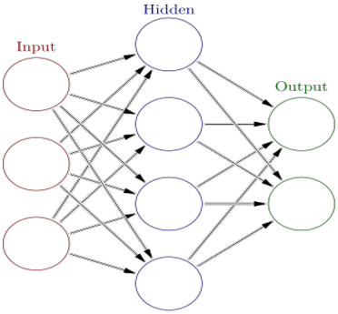 This is a machine learning algorithm and a semi parametric method used for predictive modeling and studying the trend in a data set. Artificial Neural Network is a form of semi parametric method where the output is executed by a programmed nonlinear function on multiple inputs. Neurons in the neural network model re grouped into the input layer, hidden layer and output layer. A neural network processes information from one layer to another through an activation function. Feed-forward neural network architecture with one hidden layer is given in Figure 2. Figure 2 is a feed-forward neural network with one input layer having three nodes, one hidden layer having 4 nodes and one output layer having two nodes.