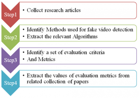 In this section, we provide the proposed methodology used to conduct this research, we are following the steps shown in Figure 1, starting by collecting papers related to deepfake video detection, ending by extracting the value of evaluation metrics.