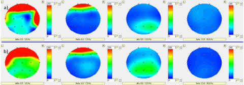 Figure 7. Brain mapping presentation of Subject_2 (the best participant) related the tongue movements (a- frequency bands’ intensities for right buccal wall touchings b- frequency bands’ intensities for left buccal wall touchings)