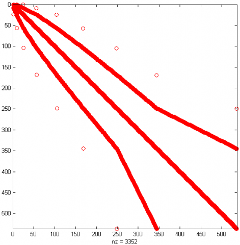 Figure 3 shows the preliminary uniformly distributed finite element model derived from the boundary curve equations of the two regions, and the total number of layers of the finite element model in each region. Figure 4 compares the bandwidth γ(K) of the overall stiffness matrix K before the node numbers are optimized by improved PSO and that after the optimization. It can be seen that, through the optimization, the bandwidth γ(K) of the overall stiffness matrix K was reduced by 34.0870% from the 575 corresponding to the serial number of commonly used nodes to 375. This greatly reduces the time to compute the effective boundary voltage of the sensitivity field, enhancing the real-time performance of the algorithm [33].