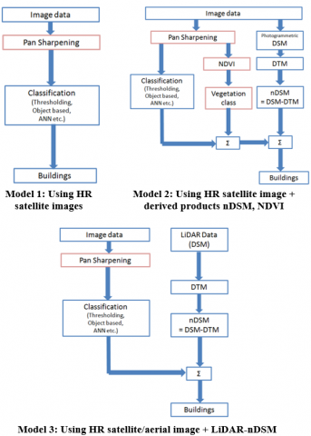 The models used on these datasets are broadly grouped into three categories as shown in Figure 1. The first model is based on using the image data directly; the second model uses the NDVI, nDSM derived together with the images; and the third model uses the hybrid approach of two independent sensor data, where the image is used in conjunction with the Airborne LiDAR-DSM. The processing algorithms used to mine the building information are supervised classification, morphological operations, object-based approach with segmentation, machine learning based approach, Fully Convolution Network (FCN), etc.