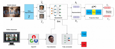 Our lie detection system performs two tasks as shown in Figure 1. In the first one, we use simple framework for contrastive learning of visual representations (SimCLR) [29] architecture to pre-train the MobilenetV2 backbone on the CelebA [30] dataset. In this approach, the MobilenetV2 backbone will learn how to extract enhanced features of faces in a sample that is close together while far from different samples. This pre-trained MobilenetV2 backbone’s knowledge will be transferred to the next stage classification task. Finally, video data from online classes is preprocessed with the OpenCV tool to crop facial areas. We obtain a face dataset with two labels telling the truth and lying. This dataset will be trained by the MobilenetV2 backbone pre-trained with the FC layer attached to perform the classification function.