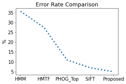 Figure 14 depicts the total error rate comparison. An improved capsule neural network reduces the error rate of the proposed technique. Our suggested method outperformed the baseline Hidden Markov Model (HMM) [50], Hand Movements Temporal Features (HMTF) [51], Pyramid Histogram of Gradients (PHOG Top) [47], and Scale Invariant Feature Transform (SIFT) [49] by 35.7%, 27.6%, 11%, and 7%, respectively, which is tabulated in Table 3. As a result, our unique approach has a 5% error rate, greater than the existing strategies.