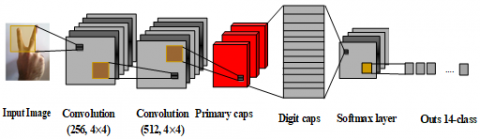 Our proposed CapsNet seems to have the following architecture: Firstly, the Relu layer would be employed to train all data input, as well as the outputs have been used as data input for such capsule networks. The same neural net was again modified to enhance its reliability in identifying hand motions by inserting additional SoftMax layers before the output layer in the CapsNet architecture. Figure 2 depicts the proposed architecture model.