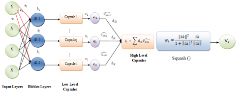 Even a non-linear squash function has been used to guarantee that perhaps the length of such a capsule's output vector equals zero whether it is short or somewhat lower than one if it is long. Eq. (6) contains the squash function formula.