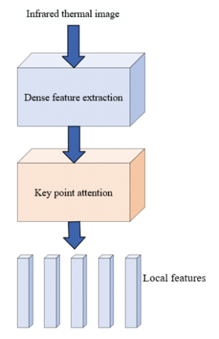 In target area extraction of infrared thermal image, though a deep learning model can be constructed to extract dense local features in the image, the problem of false target area matching caused by high similarity descriptors in different local areas in the model has not been resolved and the accuracy of target area recognition is greatly affected by some incorrect matching points. Therefore, based on the feature matching results obtained in the previous section, this paper proposed a target area extraction method for infrared thermal images based on thermal feature descriptors, which combined extracted thermal features with semantic attributes of each area in the image, thus achieving the distinction of subtle differences between sub-categories of infrared thermal images. Figure 3 shows the algorithm flow.