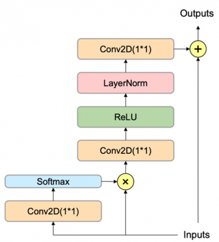 The convolution operation utilizes local information to calculate the target pixel, and the receptive field is determined by the size of the convolution kernel. Due to the inability to introduce global information, traditional convolution has limitations in prediction. Currently, there are some straightforward methods to alleviate this problem, such as using larger convolution filters or building deeper networks. However, these methods do not significantly improve the results. The receptive fields of specific layers are still limited even with feature fusion, which increases the computational costs. The SSD algorithm does not consider the impact of environmental context on local objects, greatly limiting its ability to recognize small-scale, occluded, and low-resolution objects. There is a certain positional correlation between different pieces of power equipment. For example, in large-scale datasets, transformer equipment is usually installed between two utility poles; in small-scale datasets, there are adjacent positions between insulators and crossbars. Introducing context information into the model can implicitly model the positional correlation between different pieces of equipment and avoid missed or false detections. However, not all environmental context information is beneficial to improving object detection performance; adding meaningless background noise may even impair detection performance. Therefore, identifying useful context information is necessary. We introduce a global context block (GCBlock) for modeling context semantics at specific query positions. It can help the model assign different weights to remote positions of the input, extract critical information, and make more accurate judgments without causing significant computational and storage costs. As shallow feature maps contain more context information, the first three feature maps output by the backbone network are input into the GCBlock for context information extraction to obtain more accurate positional correlation modeling. Figure 5 shows the network structure of the global context block.