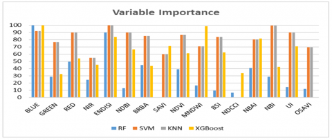 For KNN and SVM, key features were (ENDISI = 100%, NBI = 99.62%, BLUE = 91.93%, NDBI = 90.05%, and UI = 90.05%).