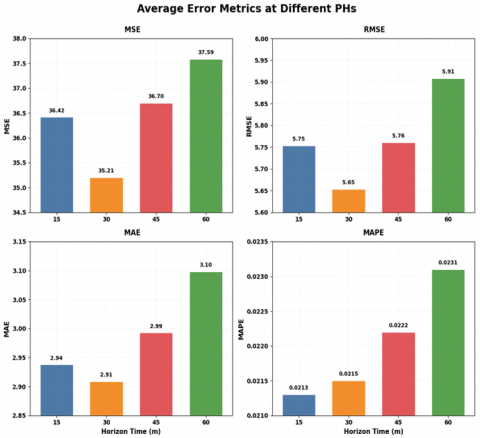 Figure 3. Prediction results of the OALSTM-BGLP model under 15 m PH (a-b) MSE and RMSE (c-d) MAE and MAPE