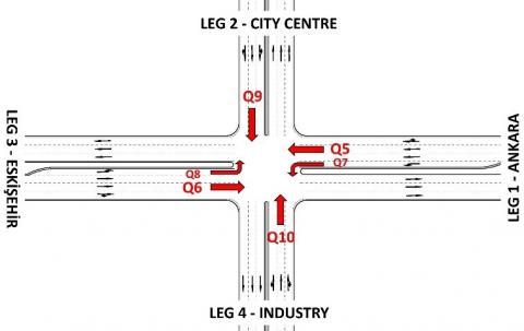 As illustrated in Figure 2, the Sanayi Intersection is composed of four legs and six traffic flows. In the aforementioned figure, the legs are indicated as follows: