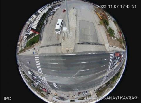 In order to ascertain the delay values at the intersection, a visual detection method was employed utilizing a camera. Images captured by a fisheye camera between 17:30 and 18:30 on November 7, 2023, document the operation of the Sanayi Intersection under a fixed-time signaling system. Over the course of this observation period, the movement of 40 vehicles entering each traffic flow at the intersection was monitored. The timing process was initiated when a vehicle was first observed inside the camera's coverage area. Upon observation of the vehicle, the stopwatch was initiated, and the time was recorded as Tin when the vehicle began to decelerate. Subsequently, the vehicle was monitored as it traversed the intersection until it was no longer inside the camera's coverage area. The elapsed time was recorded as Tout when the vehicle exited the reference point within the camera's field of view. The difference between Tin and Tout yielded the delay experienced by each vehicle. The data set comprised observations of 40 vehicles across all traffic flows. The mean delay per vehicle was calculated based on the aforementioned 40 vehicle observations. Figure 3 illustrates the fisheye camera image utilized for visual detection.