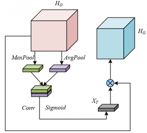 Finally, element-wise multiplication was performed between XT$~$and HO, yielding the feature map filtered by the spatial attention network: